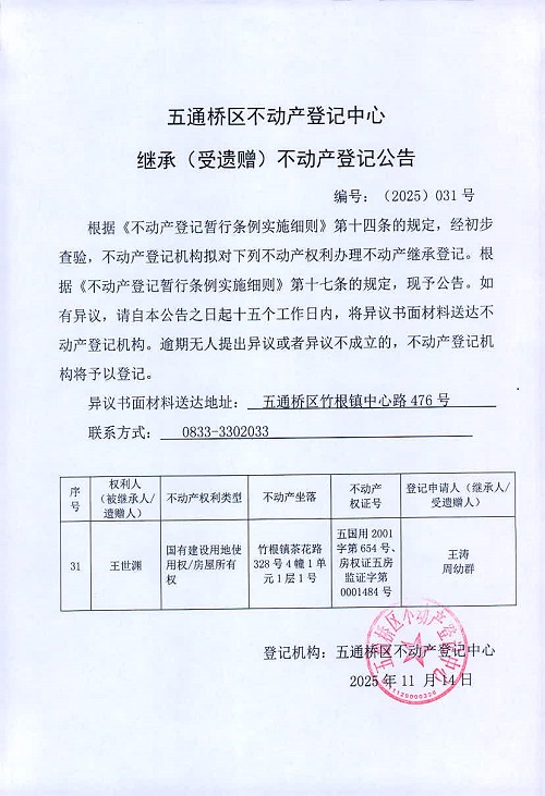五通桥区不动产登记中心 继承公示 (2025)031号