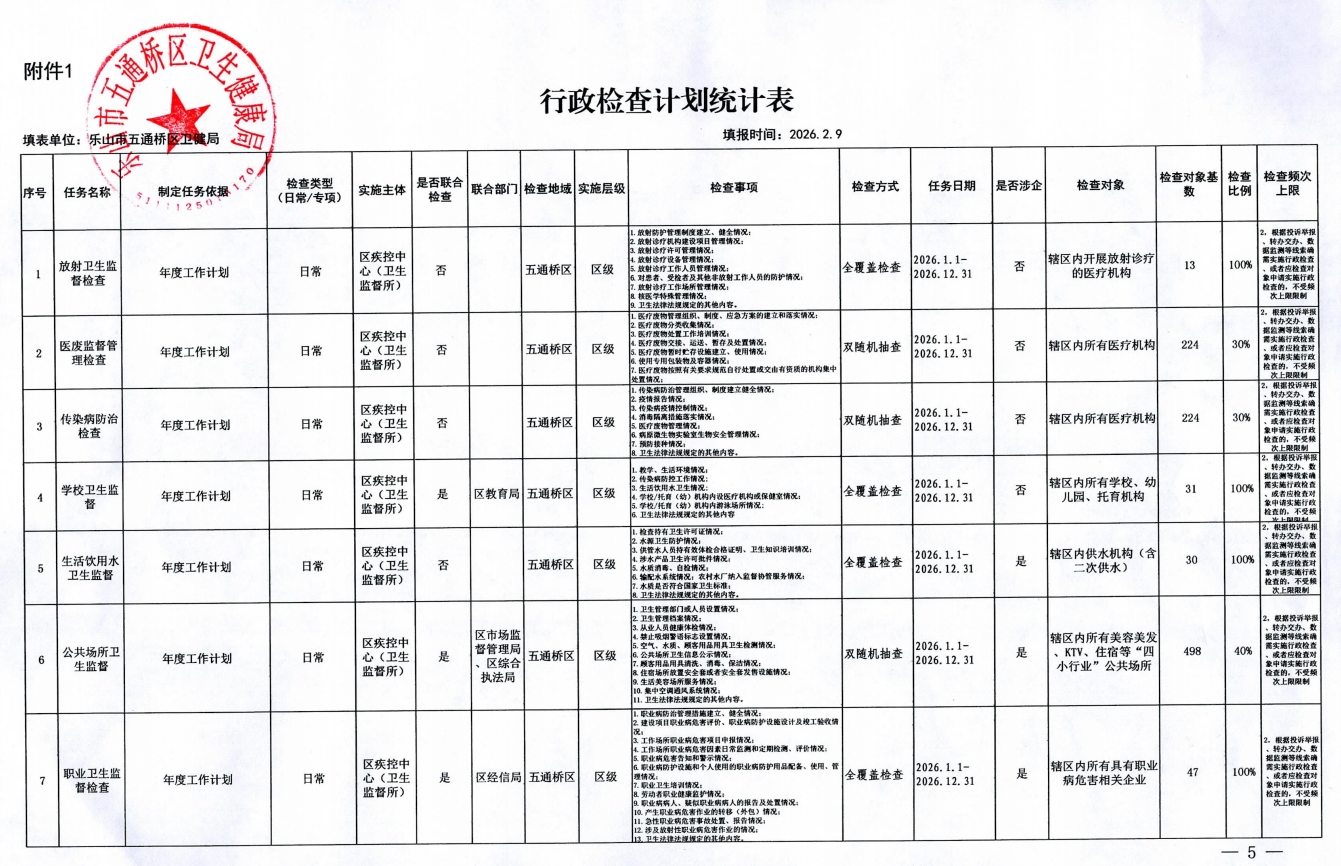 乐山市五通桥区卫生健康局2026年行政检查计划表