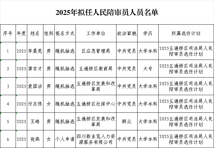 根据《中华人民共和国人民陪审员法》《人民陪审员选任办法》和《四川省司法厅四川省高级人民法院四川省公安厅关于全省人民陪审员选任工作的实施意见》(川司法发〔2018〕186号)文件规定,乐山市五通桥区司法局会同乐山市五通桥区人民法院、乐山市公安局五通桥区分局面向社会公开选任人民陪审员,通过发布公告、确定候选人范围、资格审查、征求个人意见、信息采集、拟任抽选等选任程序,拟确定以下6名同志为五通桥区人民陪审员,现予以公示。