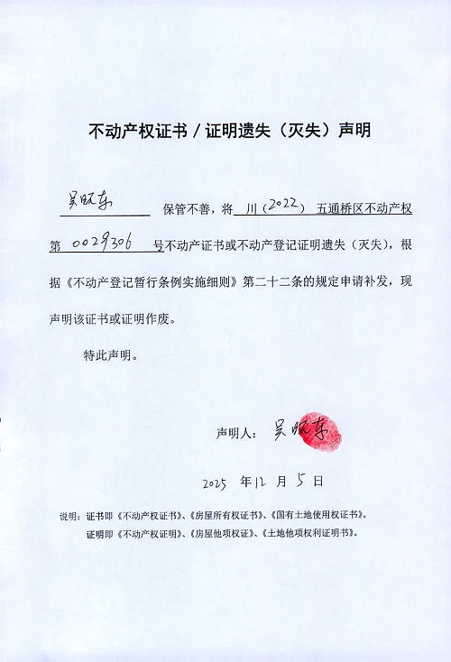 吴晓东 遗失声明