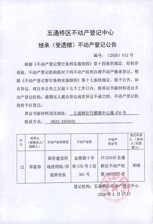 五通桥区不动产登记中心 继承公告(2026)012号